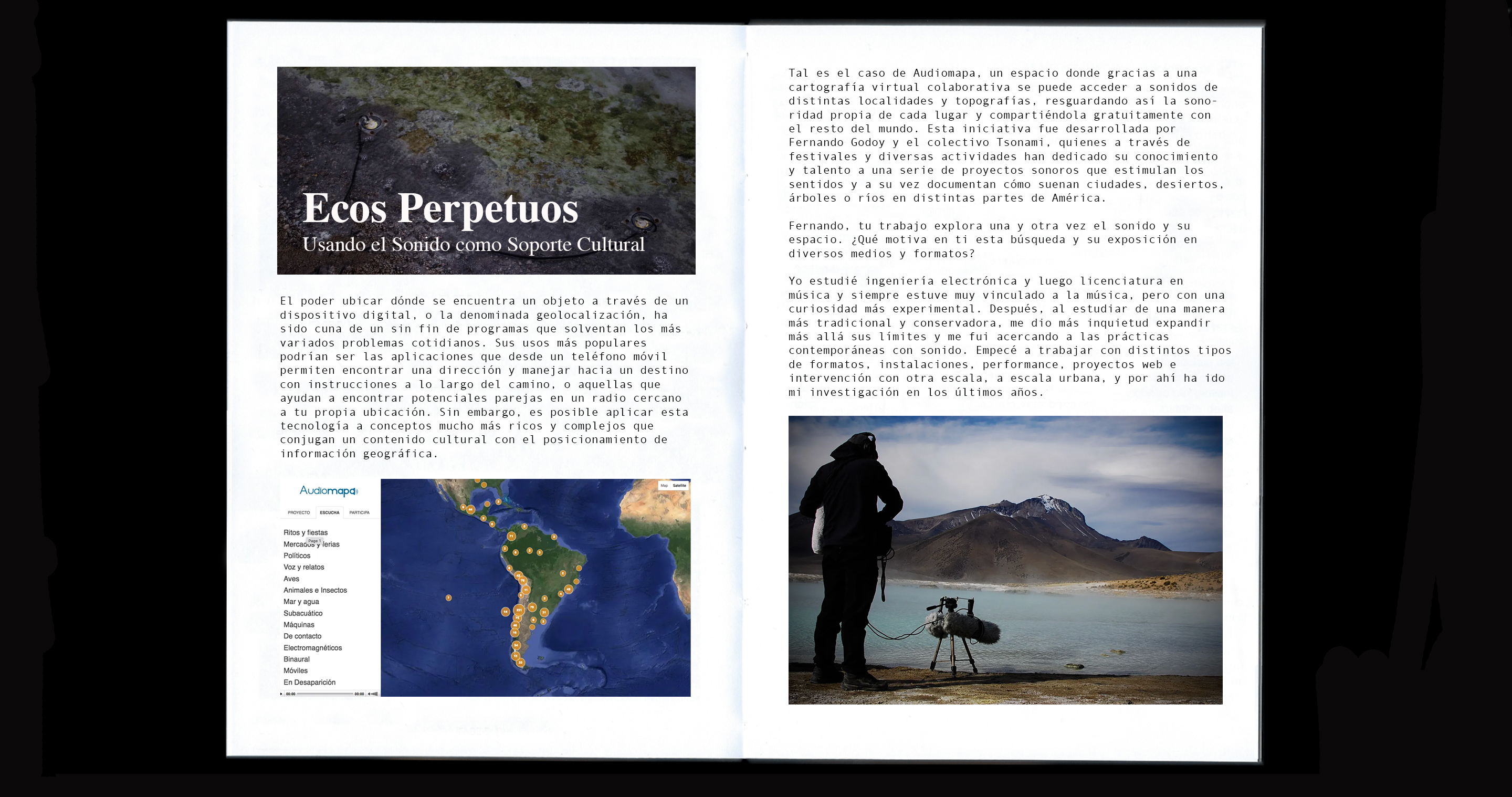 Entrevista a Fernando Godoy para revista “Endémico” para conocer sobre su proyecto Audiomapa, una plataforma digital que alberga sonidos de todo el mundo y los dispone según su geolocalización.